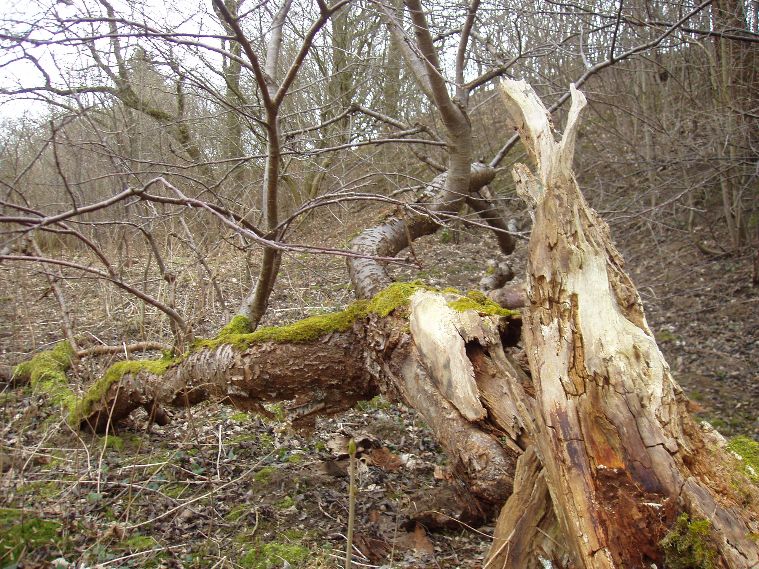I den vilde del af haven, den del, der engang for mange år siden var en frugthave, ligger et væltet træ. Et kirsebærtræ. Det er knækket en meter oppe. Et alvorligt brud. Det lå der allerede, da vi kom hertil for snart ni år siden.