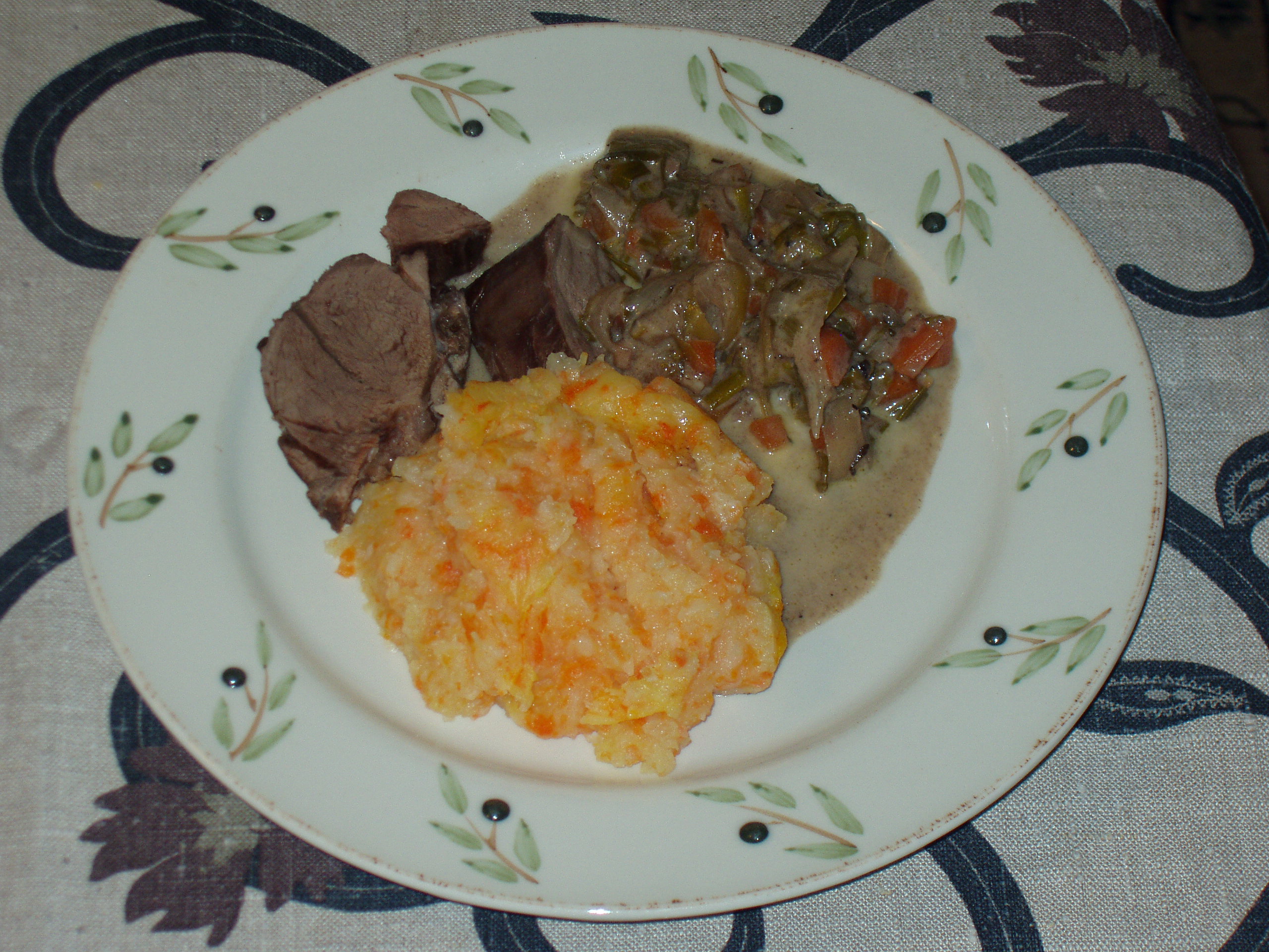 Så blev det taget op, tørret af og brunet på alle sider. Marinaden og lidt vand blev hældt ved. Da det kom i kog, blev det skummet grundigt af, og grøntsager i tern – en blanding af gulerødder, løg og porrer – blev lagt ved. Det simrede i en lille times tid, til det var mørt, før kødet blev taget op og lagt på et bræt, så det kunne stå og samle sig.