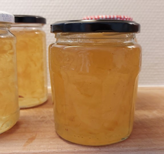Og man skal bruge en kartoffelskræller, en lille skarp kniv, et rivejern og alt det sædvanlige syltegrej – gryde, syltetragt, skål til at skumme af i, vægt, glas, ren karklud osv. Sådan en gang marmelade tager det også tid at rydde op efter. Men det er umagen værd.