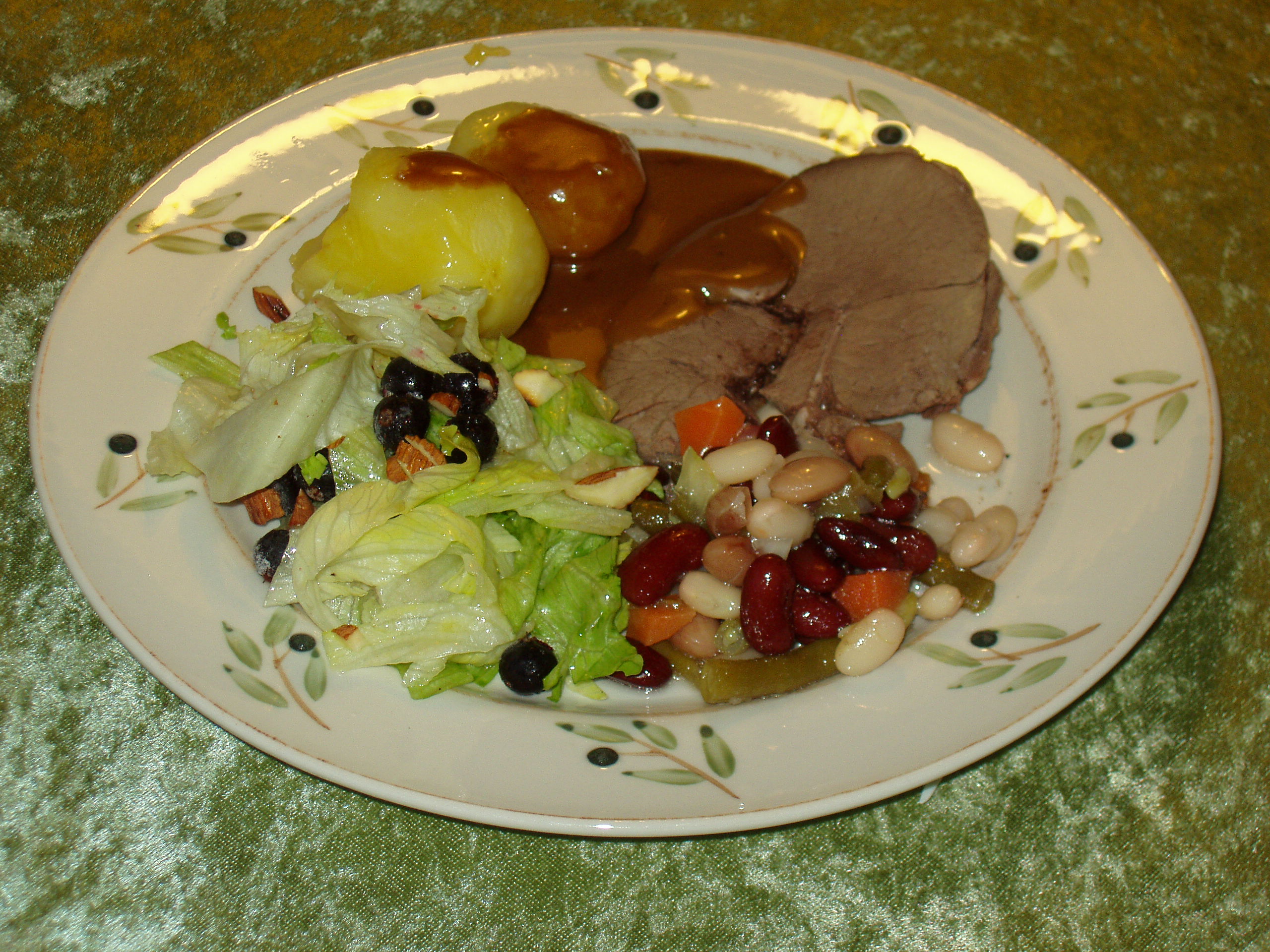 Men der var skam også tid til gæster. Bondemanden – i sin egenskab af jægersmand – nedlagde et rådyr i efteråret, så det endte med en helstegt dyrekølle, med kartofler, klassisk vildtsauce, bønnesalat (mere herom en anden dag) og en salat med nødder og solbær i en mild olie/eddike dressing. En klassisk vildtmenu.
