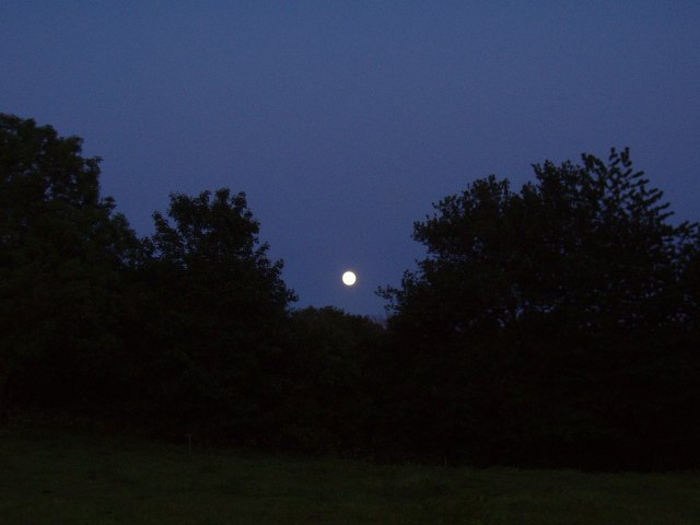 Månen er stået op, men det er stadig lyst, og der er stadig aktivitet på markerne omkring Skivholme.
