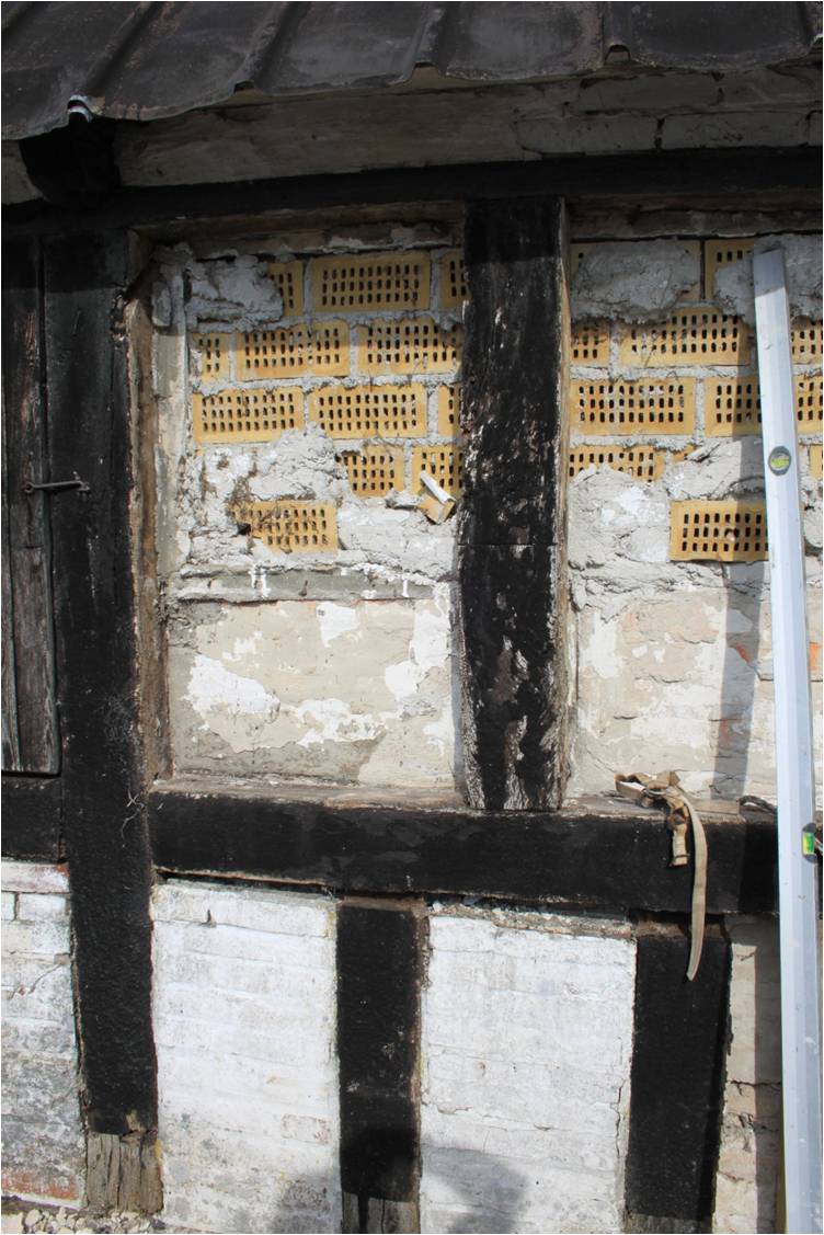 Det gamle bindingsværk skal repareres. En mur er halvt revet ned og skal bygges op igen.