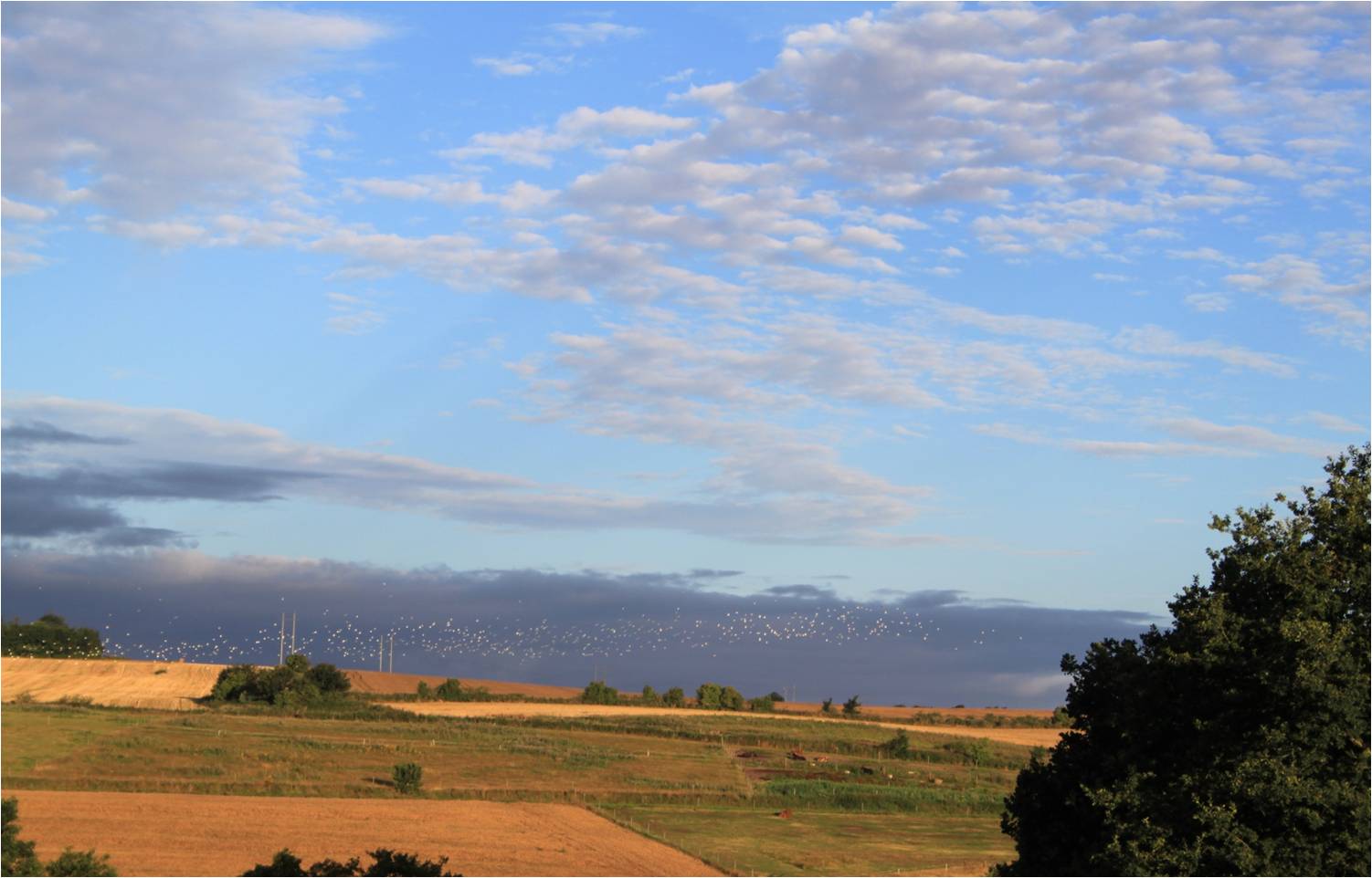 Solen skinner på flok måger, der lyser mod en grå nattesky på vej væk.