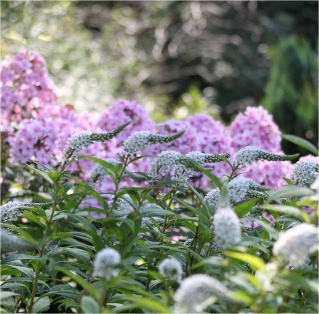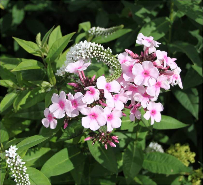 I den blidere ende af farveskalaen finder vi de forundelige floks, høstfloks, phlox paniculata, og de vildtvoksende hvide fredløs, lysimachia clethroides (sådan et smukt navn) – der lyser op og dufter i augusthaven. Lige nu er blomstringen på sit højeste.