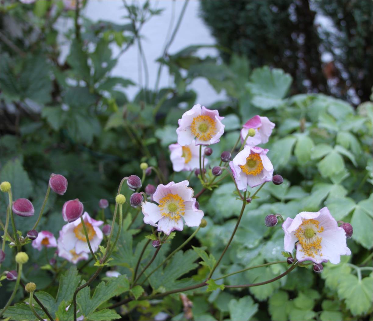 Høstanemonernes blomster svæver yndefuldt over de mørkegrønne blade.