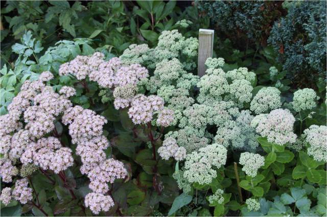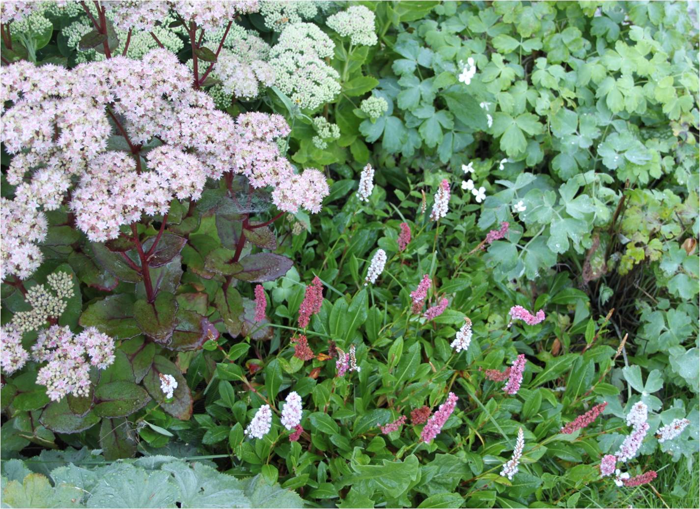 En anden stærk og voksevillig staude, der blomstrer nu, er sankthansurt, sedum spectabilis. I staudebedet har jeg to havevarianter. En med lyse blomster, røde stængler og rødlige blade, der begynder at blomstre i august, og så den ‘almindelige’ med mørkere røde blomster og lysegrønne stængler og blade, der blomstrer i september. De klæder hinanden godt.