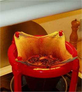 Nå – men – mens jeg har tænkt disse tanker og blevet velbehageligt harm over verdens dårskab, er bærrene kogt, og de skal nu over i en saftpose og dryppe af.
