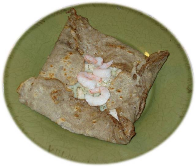 i et lykkeligt blandet ægteskab. Franske crepes med svensk inspireret rejefyld i dildsovs.I Sverige gør de meget i dildsovs til laks, og jeg har prøvet at gøre dem kunsten efter – med rejer i stedet for laks. Det lykkedes faktisk rigtig godt og udgjorde en smuk helhed.