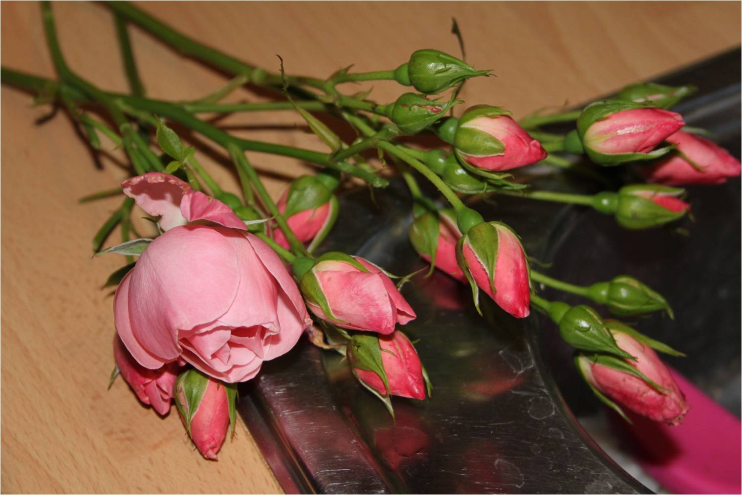 Et par hektiske timer senere så køkkenet ud som om nogen havde tabt en blandet landhandel på alle flader – incl. gulvet, hvor bondemanden havde indrettet sig med en stol, nogle hegnspæle og lidt ting, der skulle skrues sammen – så kunne vi jo snakke, mens vi arbejdede. Jeg for lige ud for at plukke nogle rosenknopper til tørring – hvad er juledekoer uden tørrede rosenknopper? En rose så jeg skyde og alt det der??