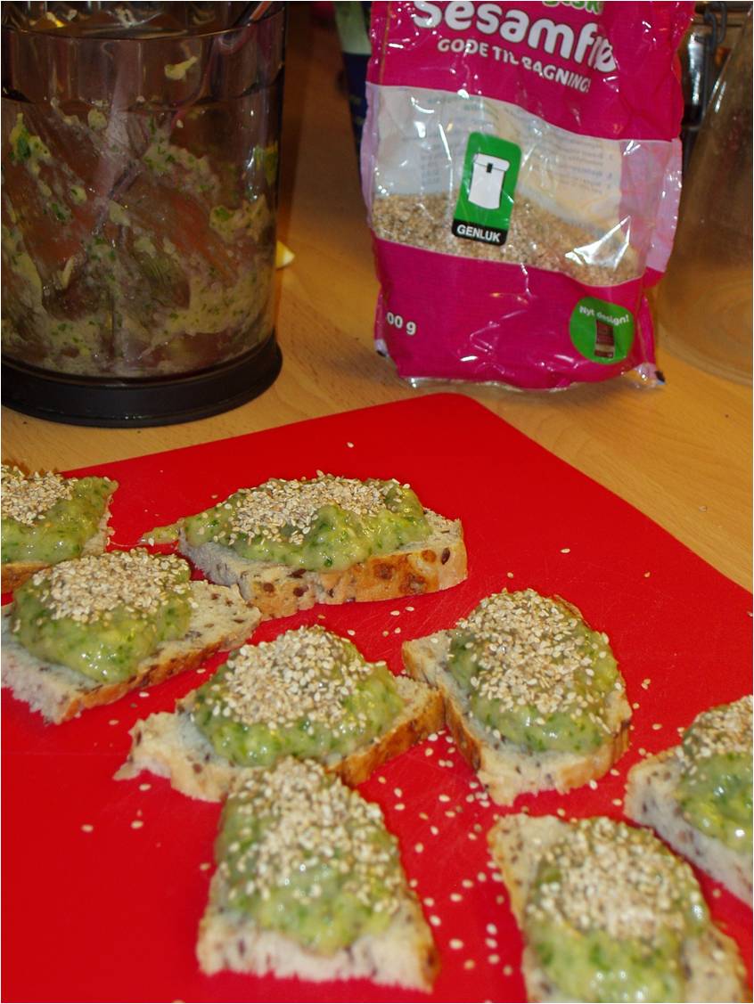 Riv ingefær og hvidløg, skær forårsløgene i mindre stykker og  put så det hele undtagen brød og sesamfrø i lynhakkeren og kør det til fars. Lad det hvile lidt.