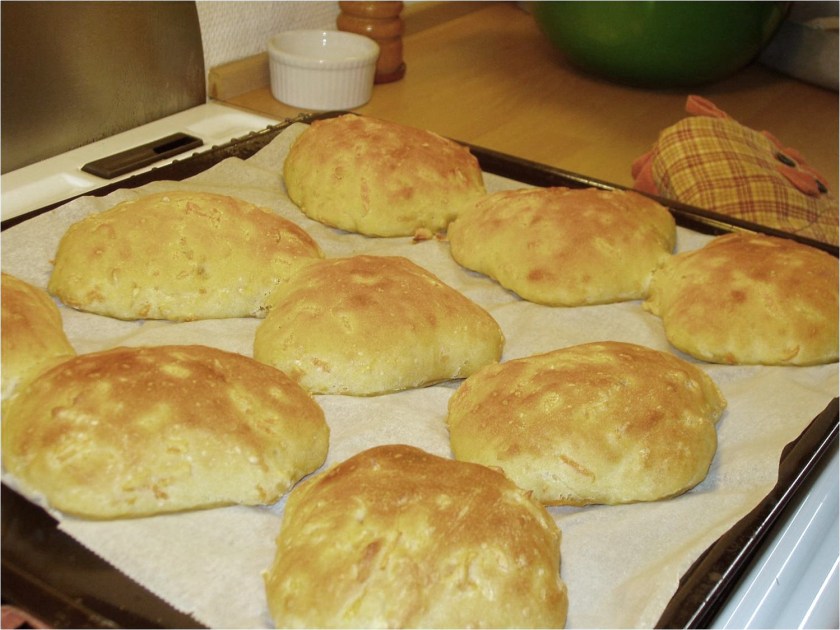 Lad dem efterhæve i tre kvarter til en time og bag dem et kvarter på 200. Bollerne smager godt helt uden noget – men de er også gode som sandwichboller eller med ost.
