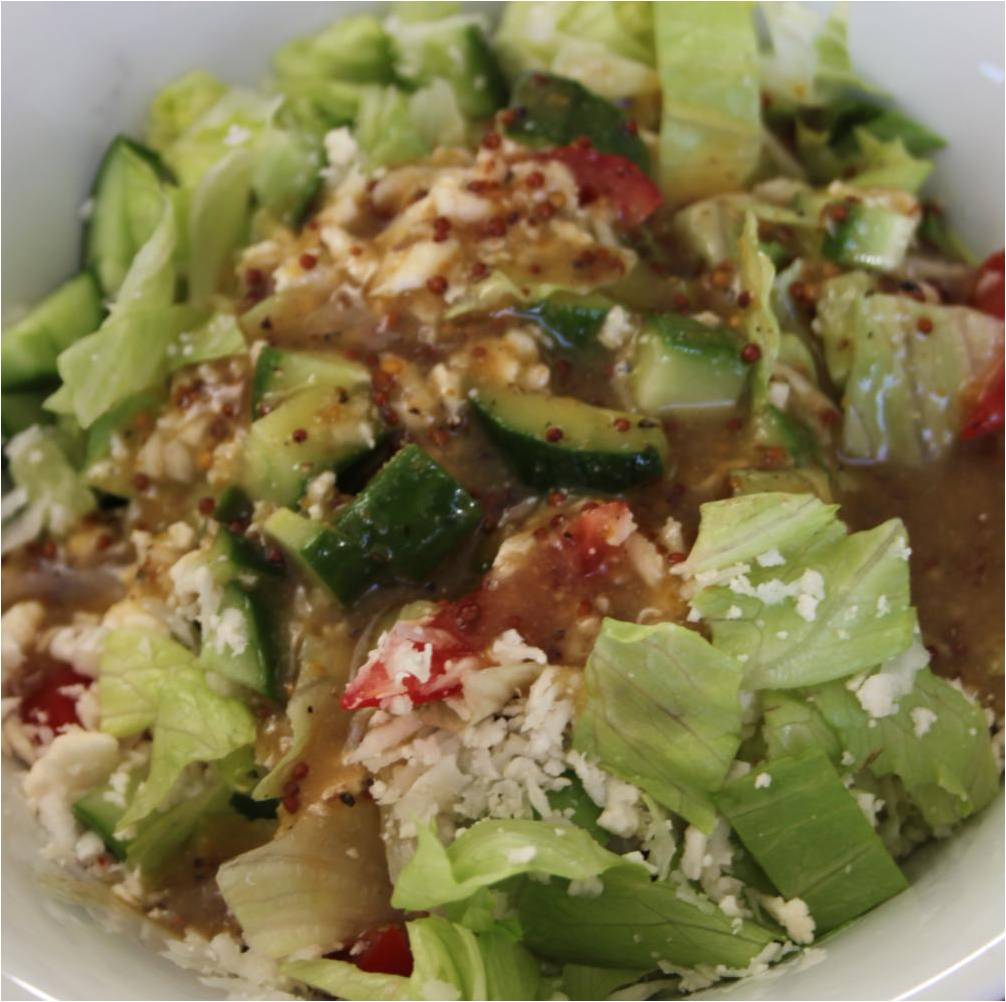 Vi brugte den til en salat med groftrevet blomkål (lidt godt er der da kommet fra de der stenalderfolk, som efter sigende er vilde med at rive blomkål), frisk krumbøjet agurk i tern, iceberg og en enkelt tomat, der havde ligget og samlet smag i vindueskarmen.