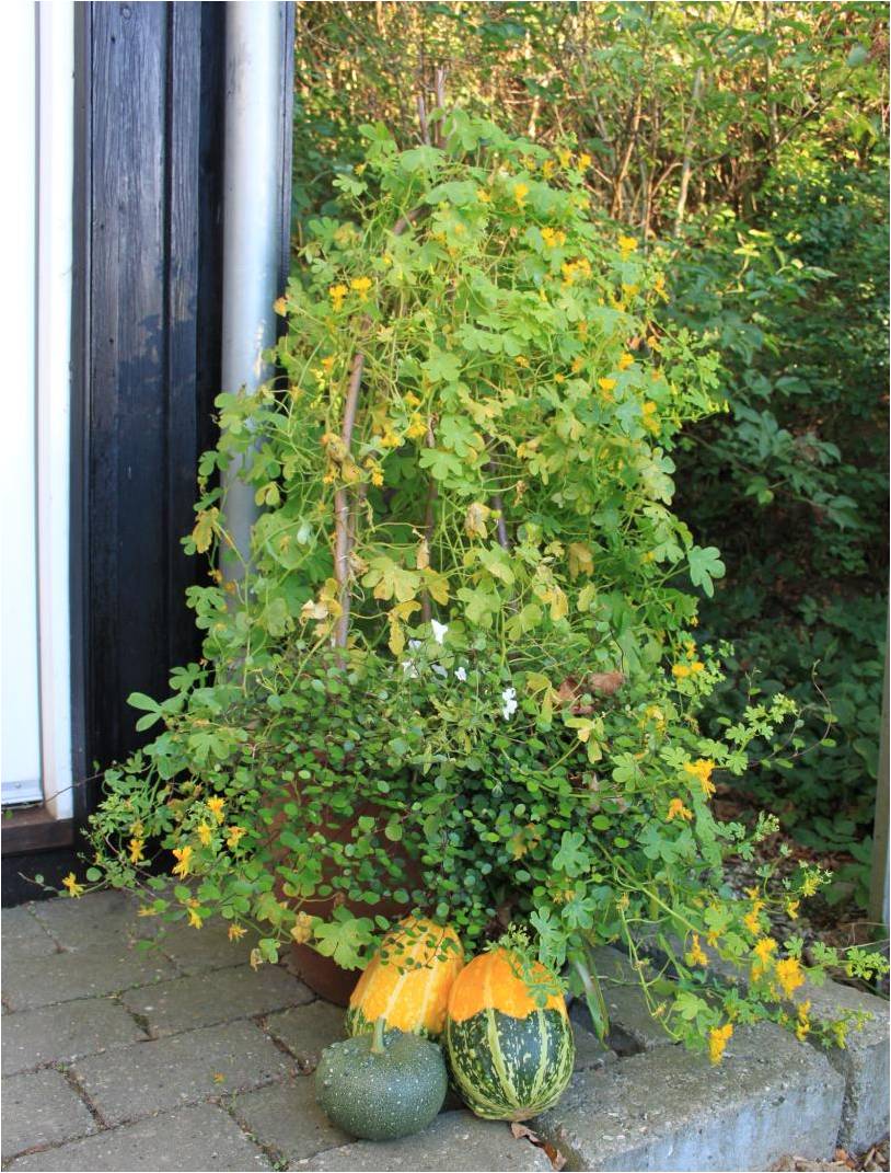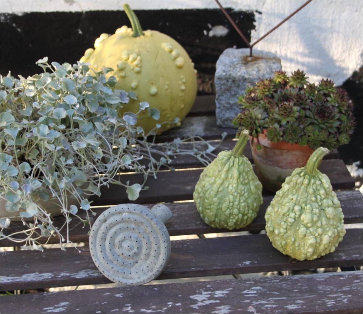 Nu kan du nok spørge om, hvad man dog skal med 100 pyntegræskar? Det er også flere, end jeg troede, jeg ville få ud af det, men jeg har brugt dem som ‘i stedet for en blomst’, og en kassefuld fik jeg byttet til et par skønne, store kuglekrysantemum i en blomsterbutik inde i Aarhus. Og så står de hist og her og allevegne i haven og huset og pynter stille og roligt. Det er alt, hvad man kan forvente af et pyntegræskar. Men er det ikke også nok?