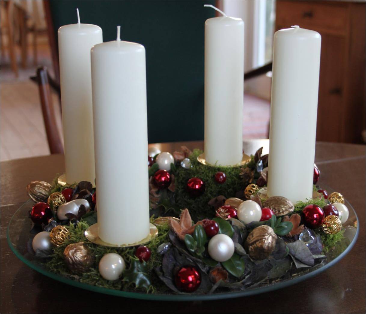 Mos, tørrede hortensia, julekugler, bog og buksbom og lidt kristttorn. Ingen minimalisme i sigte i julemåneden, så bliver nisserne sure.