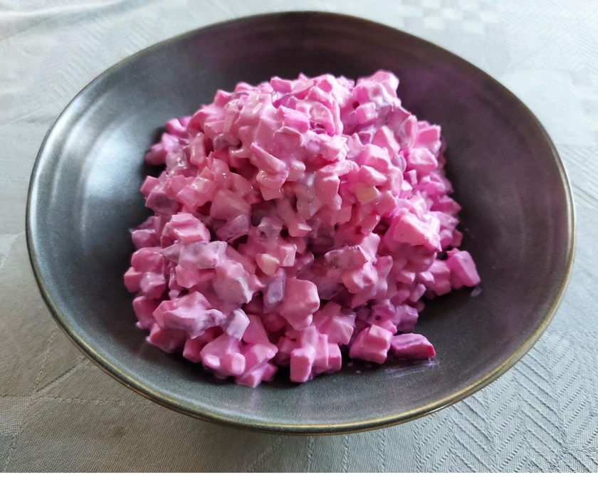 Der er meget godt at sige om den klassiske rødbede-, selleri- og æblesalat. Den ser køn ud. Den smager godt. Den er let at lave. Den er dejlig friskt – en rigtig vintersalat med knas, sødme og syre.