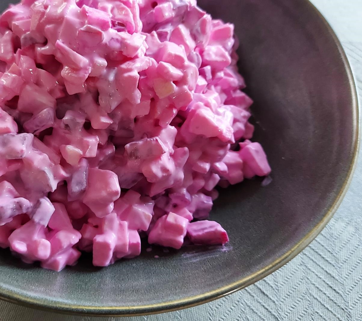 Skær æbler, rødbeder og selleri i små tern. Bland dressingen og vend det hele sammen. Lad gerne salaten stå og trække lidt. Den holder sig fint et par dage i køleskab, så lav bare en pænt stor portion. Den skal nok blive spist – og måske kan man sælge den til småpiger under navnet: Barbie-salat – eller Disney Prinsesse-salat. Farven er i hvert fald god nok.