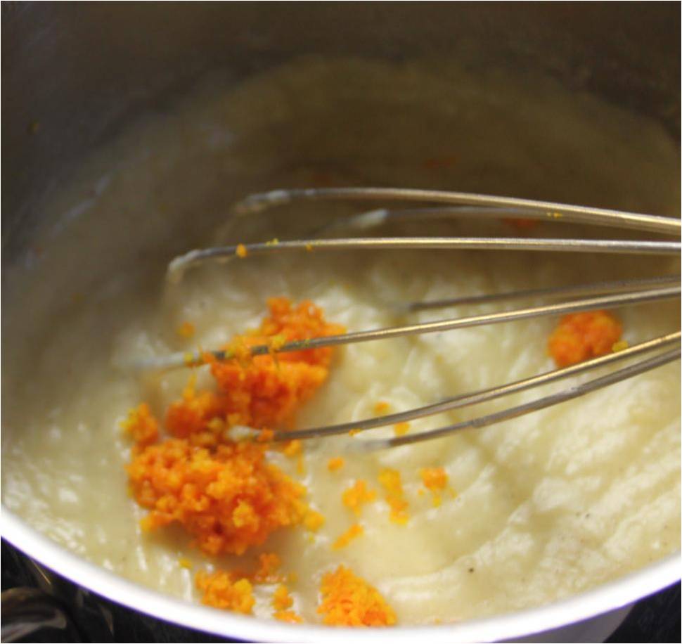 Pisk æg og sukker sammen i en kasserolle, tilsæt vanillesukker, maizena og mælk og varm det op til lige under kogepunktet, hvor cremen tykner. Tag kasserollen af blusset, rør appelsinskallen i og lad cremen køle af, mens dejen hæver færdig.