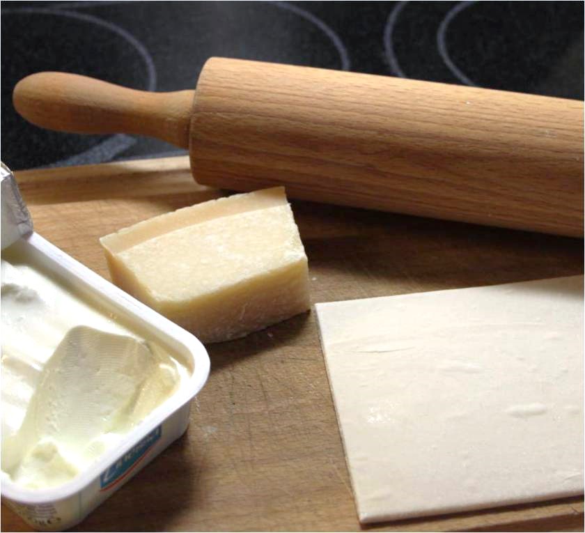 Rul pladen ud. Smør den med flødeost og drys med fintrevet parmesan. Fold den ene langside ind til lidt over midten, og den anden til lidt over den første. Rul lidt igen, så de hænger godt sammen.