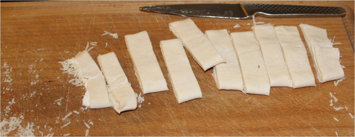 Lidt nippemad til en velkomstdrink: Små butterdejssløjfer med fyld af flødeost og parmesan, drysset med sesamfrø. Sprøde og lækre.