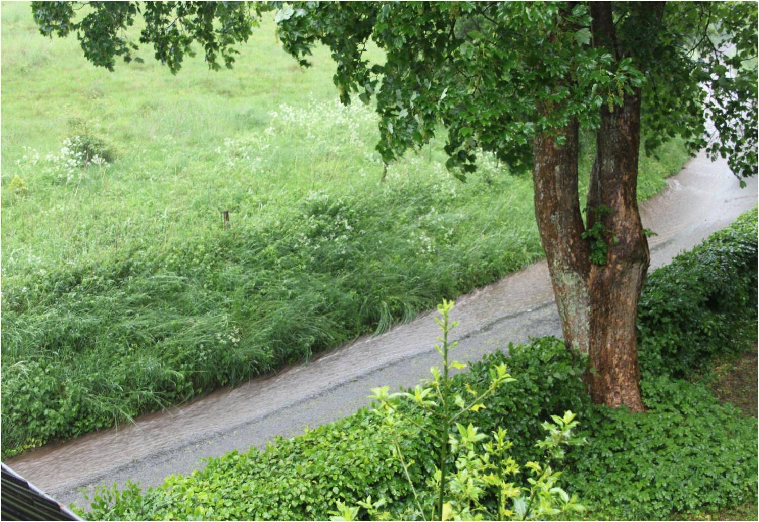 Regnen kom væltende og forvandlede vores lille, snoede vej til en rivende flod.