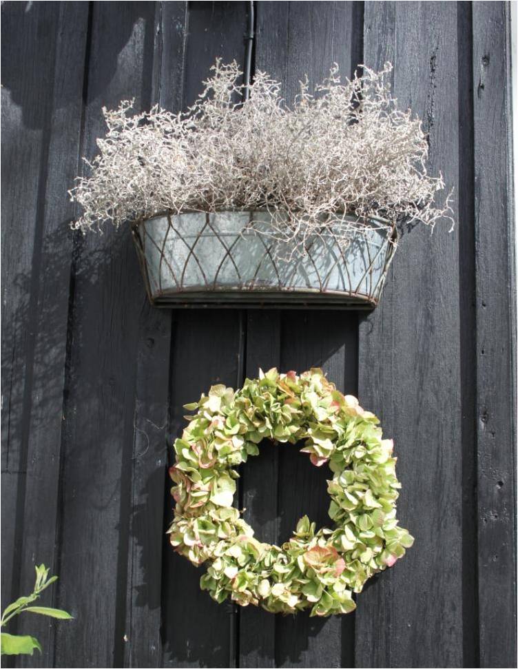 Men hvad med hortensiakransen? Den er da ikke bare røget ud, vel? Nej da – den hænger nu udenpå ‘våbenhuset’. Det lille vindfang ved bagdøren. Bagdøren skal også være hyggelig, for den bliver nemlig brugt endnu mere end hoveddøren. Vi er jo på landet.