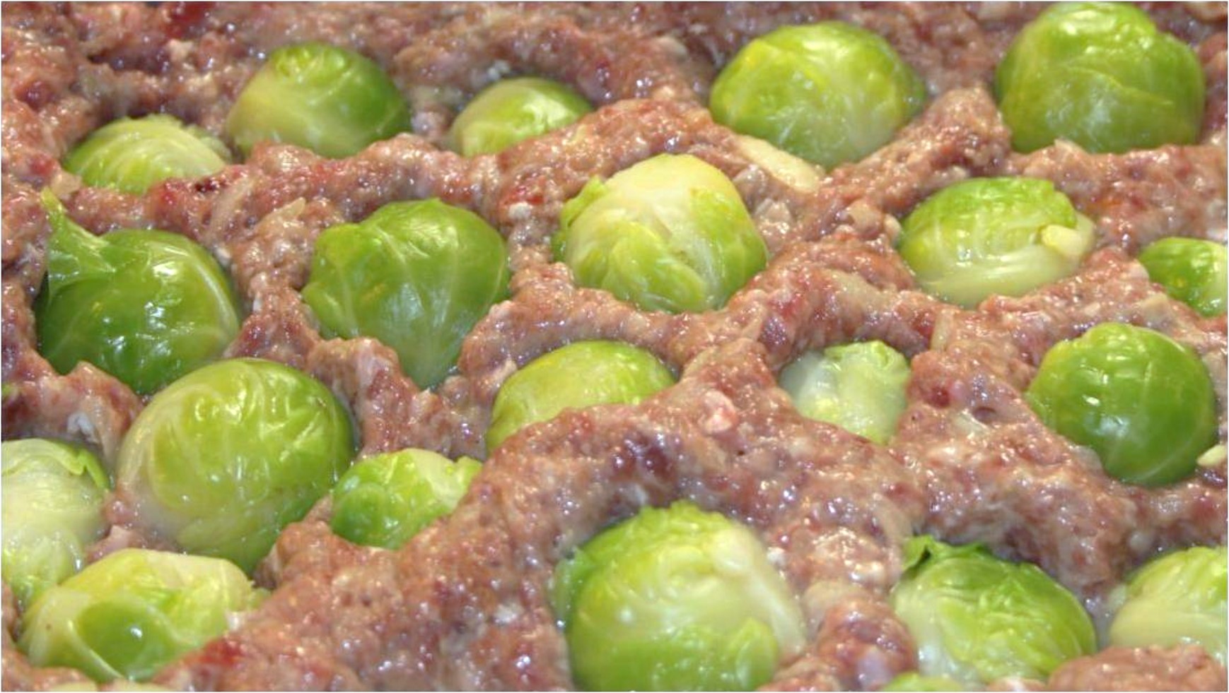 Smør et ovnfast fad med smør, så farsen ikke hænger i. Bred farsen ud i bunden af fadet. Pres rosenkålene ned i farsen,