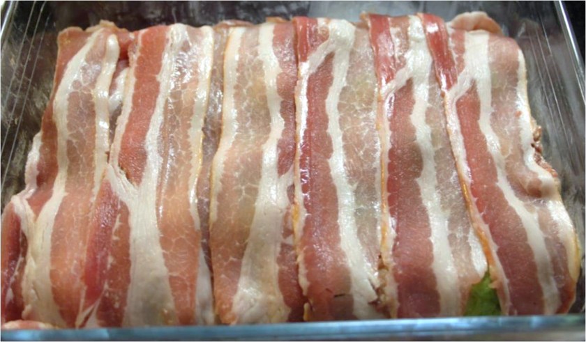 Bag fadet ved 200 grader, til kødet er gennemstegt og baconen sprød som på forloren hare. Cirka 40 minutter.