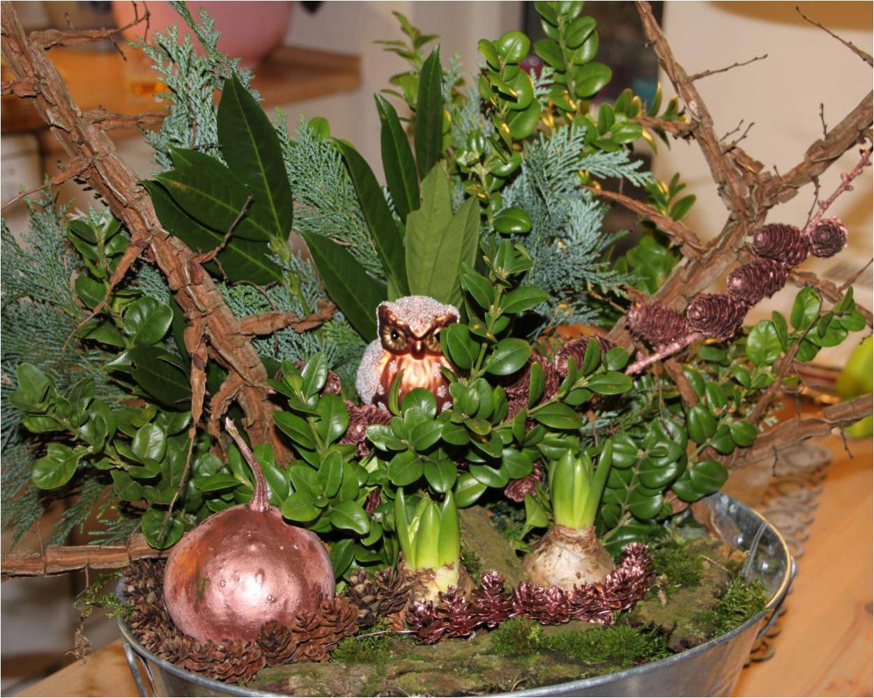 Den er den største. Lidt vild. Den skal også give mindelser om en vinterskov – mos, stedsegrønt, bare grene fra den spooky, men flotte korkelm, et par hyacinter, der kan symbolisere solhvervet og de lysere tider, der kommer – og så en ugle. En julekugleugle.