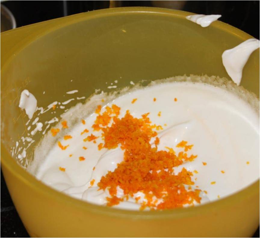 Pisk hviderne stive – meget stive. Pisk sukkeret i. Bland appelsinskal, kakao og appelsinsaft i massen.