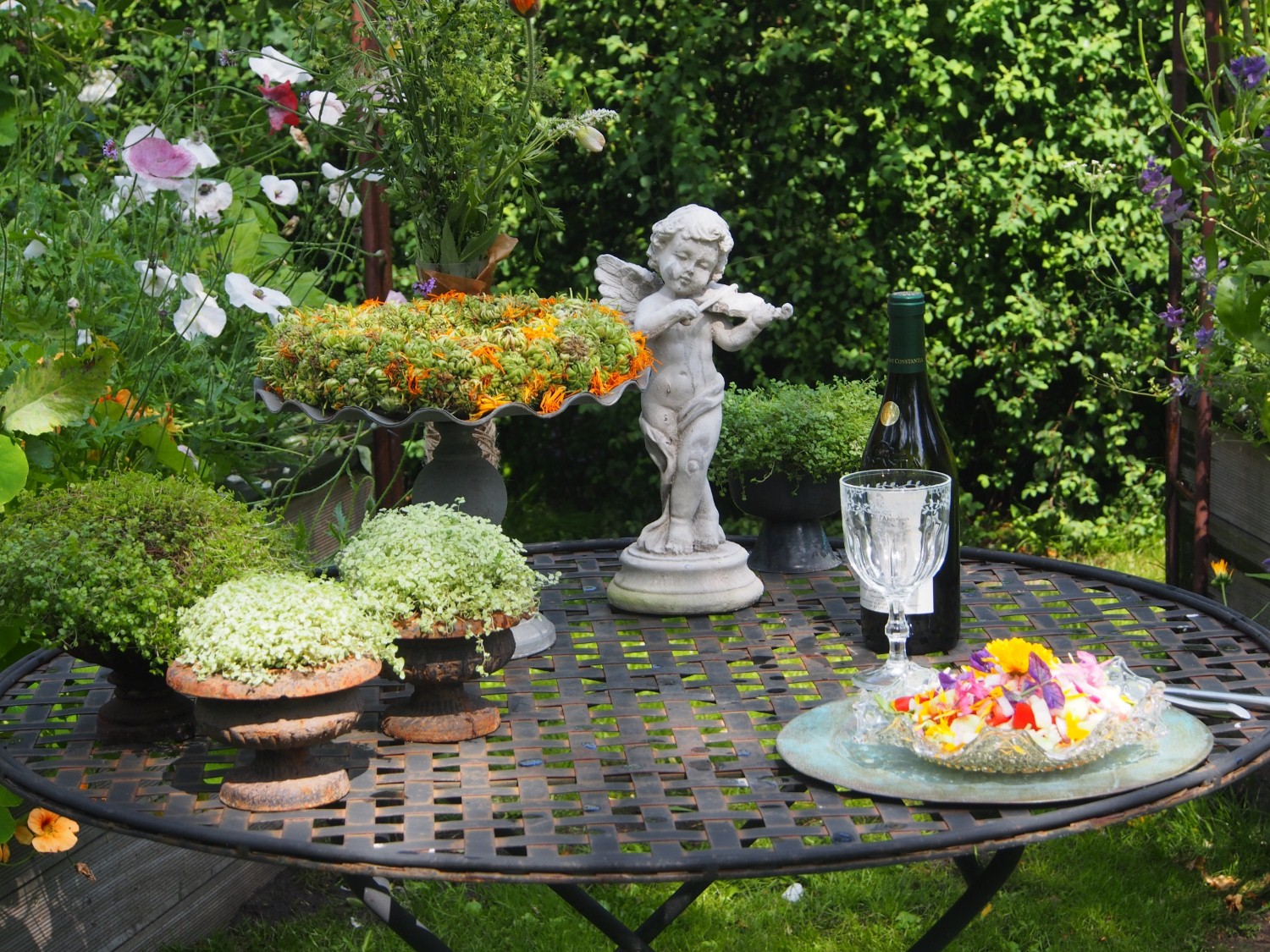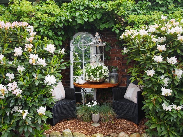 Et dejligt dueslag med hvide duer, kreative genbrugsfund og masser af skønne siddepladser og huler giver haven et romantisk udtryk.