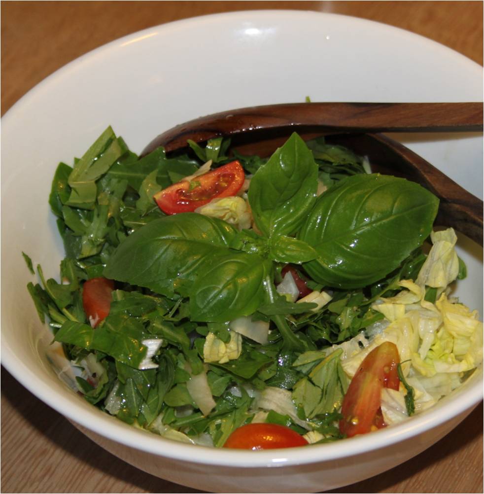 Server med kogte kartofler og en salat af blandet grønt, snittet forårsløg, frisk basilikum og tomater. Forårsfrisk, men fyldig smag. Rigtig lørdagsmad.