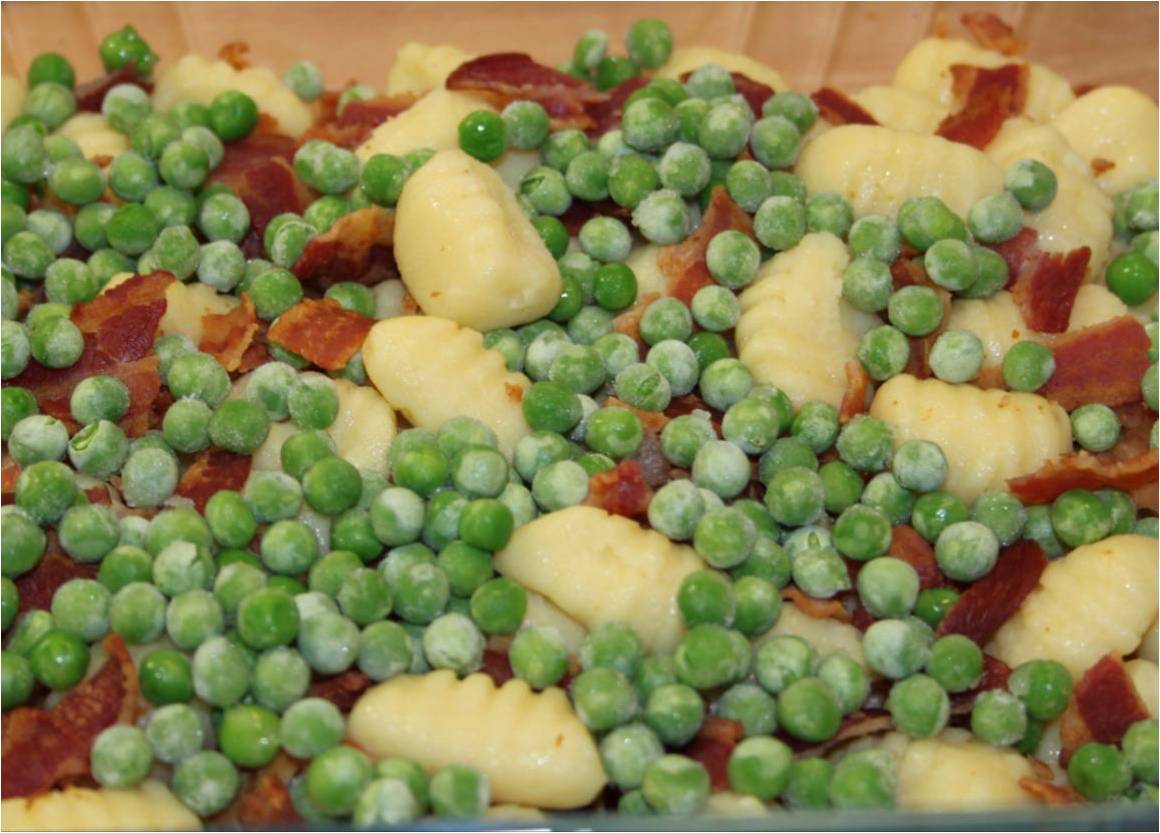 Kom gnocchierne over i et ovnfast fad. De skal ikke koges først. Knus de stegte baconskiver med fingrene og drys dem ud over. Drys med masser af ærter.