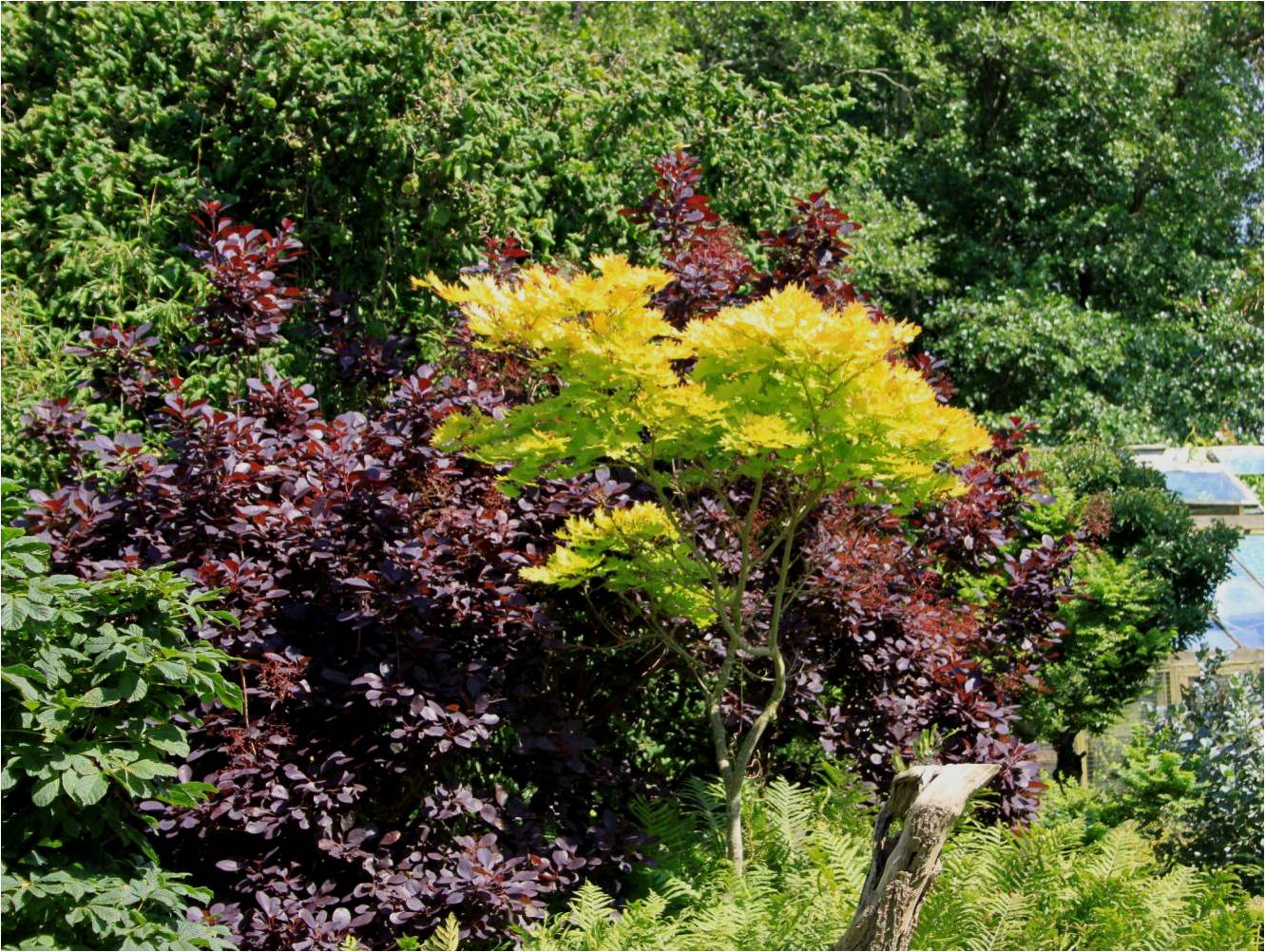 Haven er delt i to dele. Den gamle have omkring huset og den nye have overfor. Den gamle have har været 30 år undervejs, og den er fyldt med snoede stier, spændende buske og træer, hvor der er leget med bladfarver og faconer,