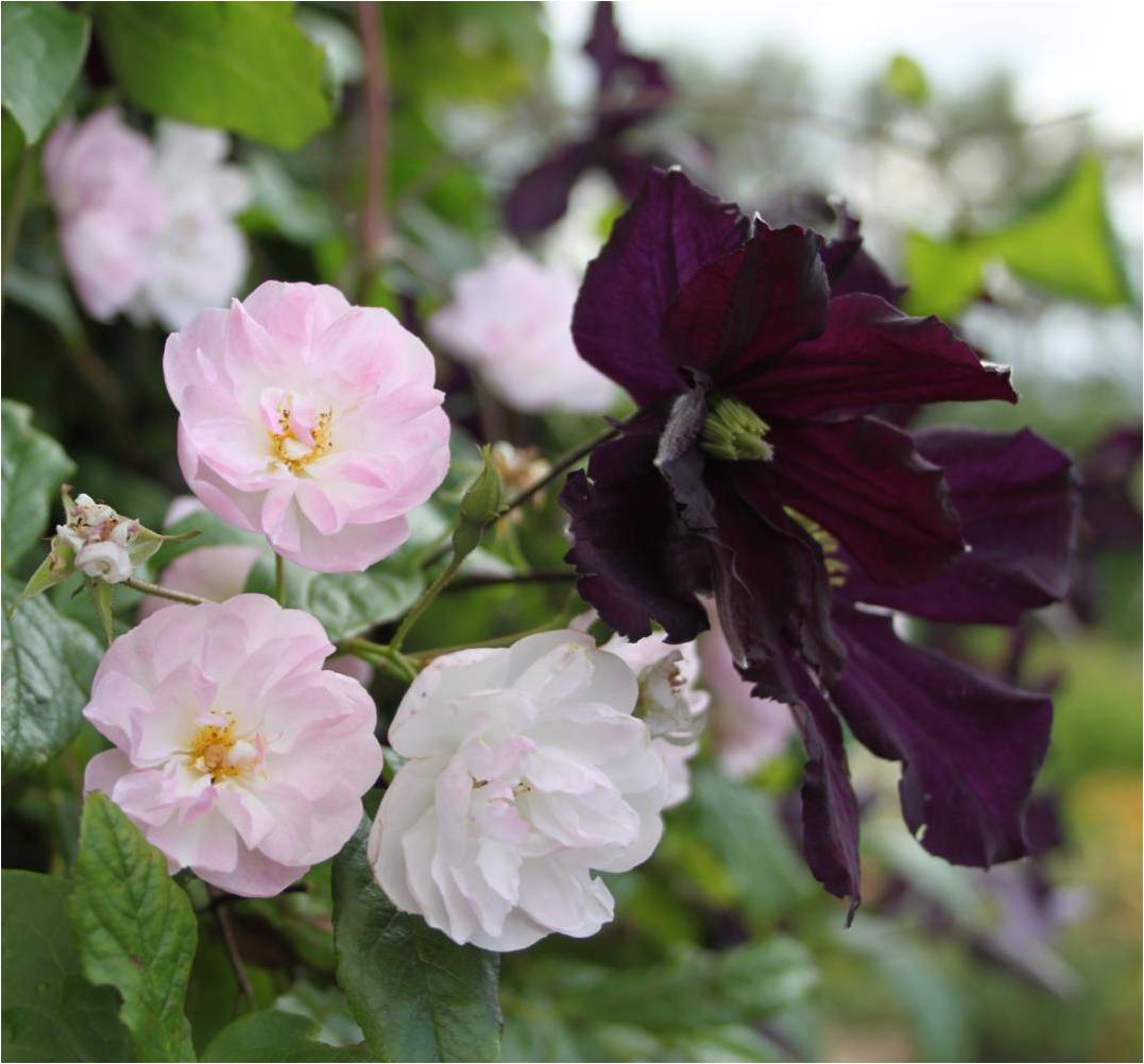 Kronens buer er tæt besat med klatreroser og klematis. Her er et glimt fra midtersøjlen.