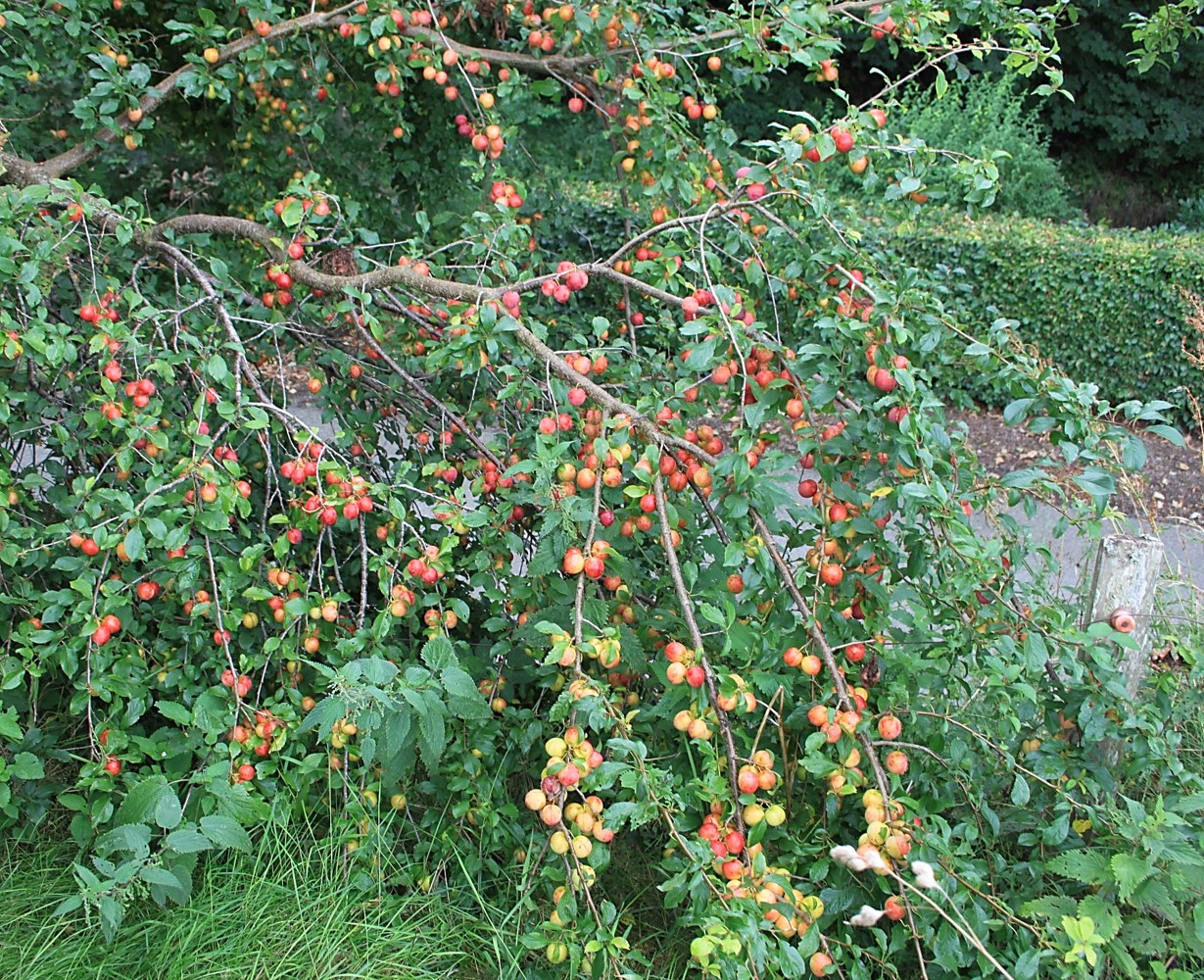 Der står flere forskellige slags mirabeller i hegnet. Gule, røde og brogede. Små og spidse og store og runde.