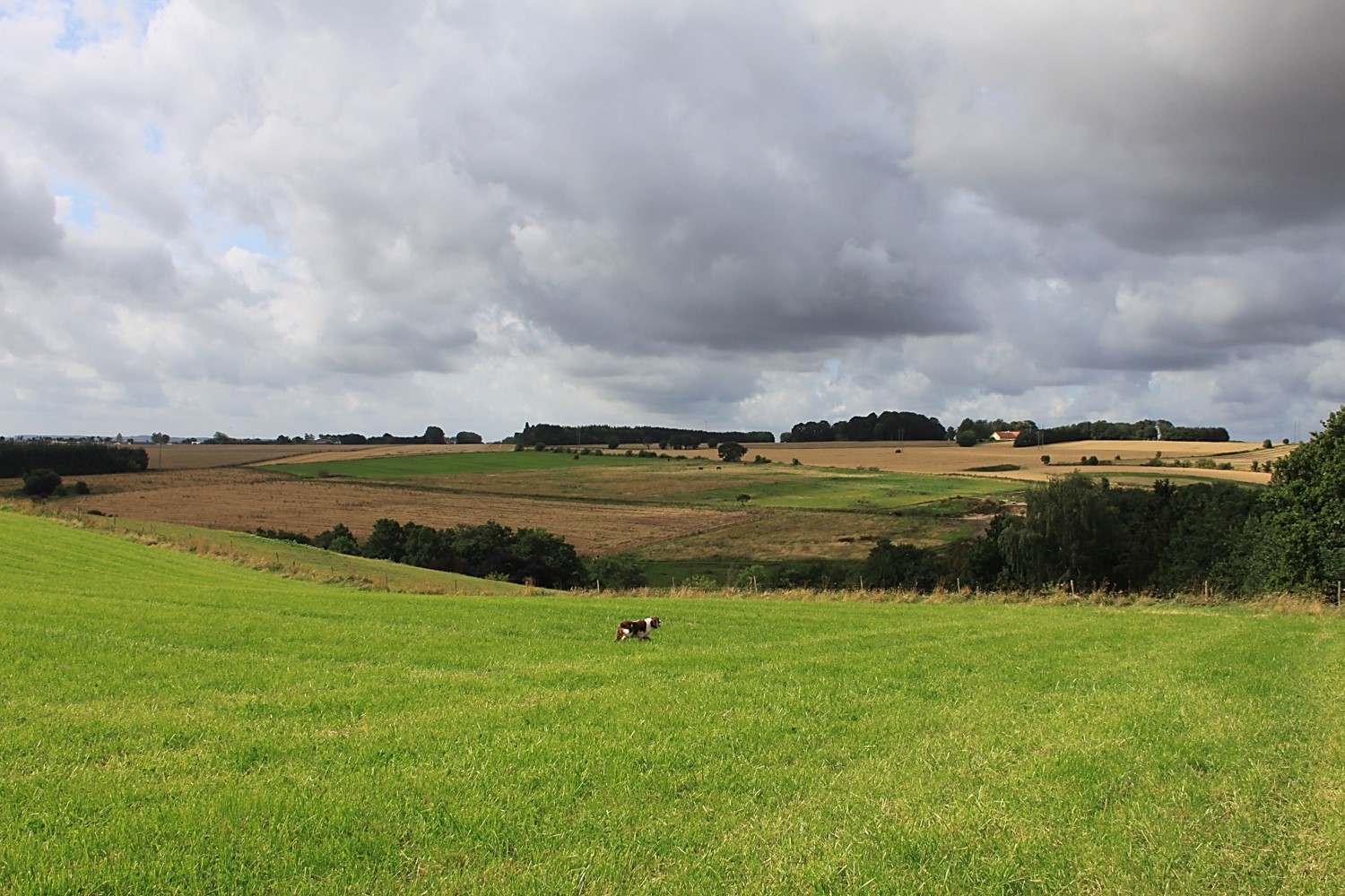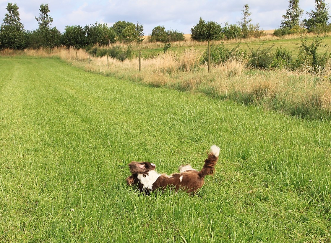 Hunden keder sig ikke, selvom jeg går der og plukker og plukker og sukker af fryd. For hvad kan være bedre end at rulle sig på en græsmark?