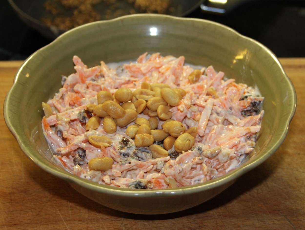 Rør yoghurten med krydderierne, riv og skræl gulerødderne, hak rosiner og peanuts groft og bland det hele godt sammen. Pynt med lidt flere peanuts. Salaten bliver bedst, hvis den får lov at stå og trække i køleskabet i mindst en halv time og gerne længere.