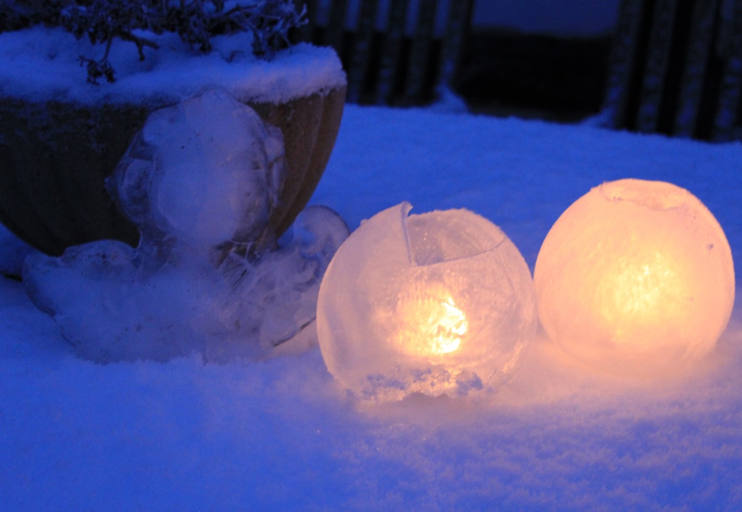 Inspireret af Fru Pedersen (Fru Pedersens Have), der havde brugt en af sine betonforme til at lave is-kogler, tog jeg en betonform ind i går, fyldte den med vand og satte den i fryseren. Her i den tidlige morgen, hvor det var ved at blive lyst, og det sparsomme lys gav det hele et blåt skær, kom englen ud af formen og ud til lysene. Poesiens blå sneblomst.
