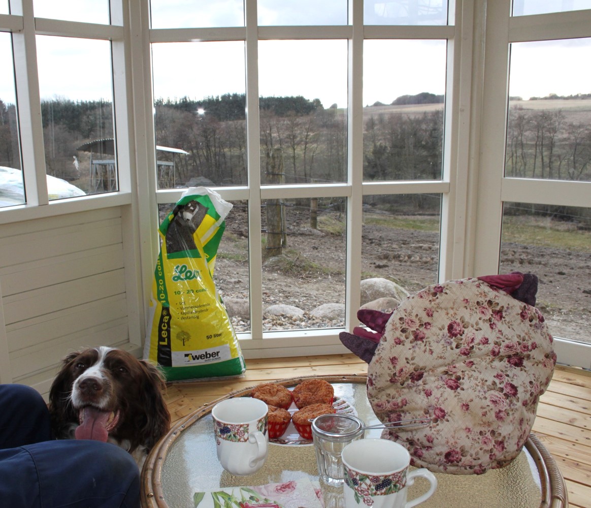 men vi er først ved at indrette og flytte ind i den nu, hvor vejret er blevet bedre. Bondemanden har isoleret under gulvet med Leca, og da det var færdigt, og der var gjort rent efter det, slæbte vi et par gode stole og et lille bord derud. Efterhånden vil der blive indrettet rigtigt, men man kan jo ikke altid vente på, at det hele er perfekt. Så kommer man aldrig nogen steder – eller får tid til at sidde et øjeblik.
