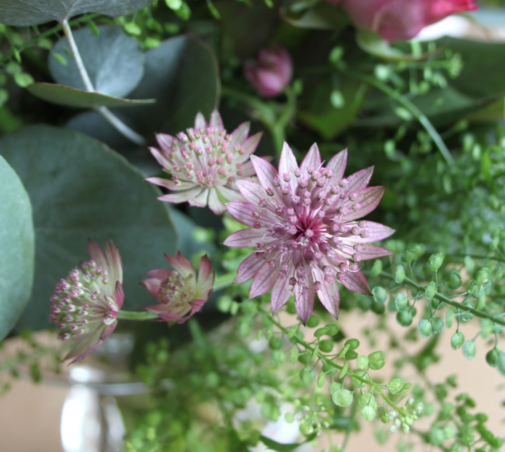 Smukke roser og stjerneskærm. Astrantia Major, som den hedder – et poetisk klingende navn til en poetisk let og yndefuld blomst.