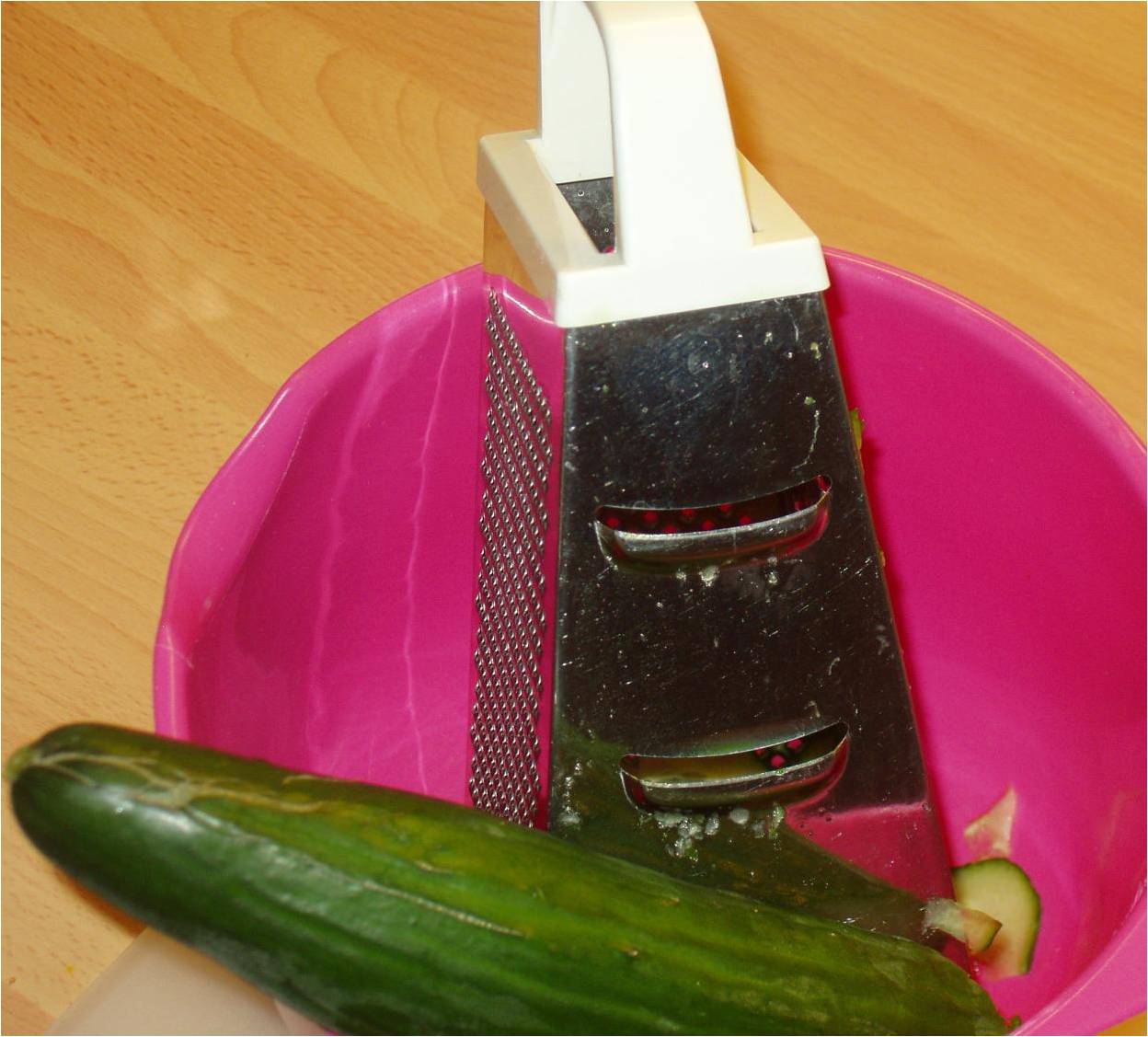 Skær agurkerne i meget tynde skiver – brug evt. agurkesiden på rivejernet – det virker.