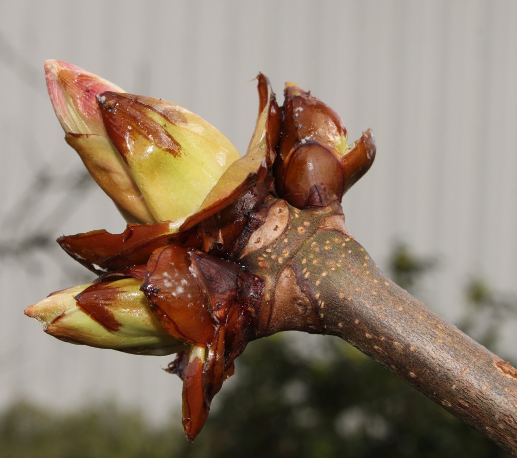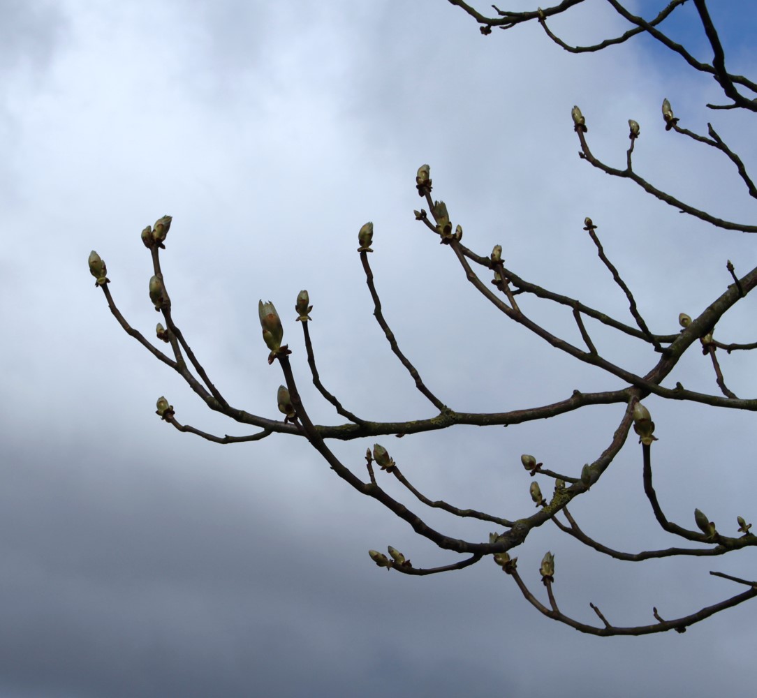 På trods af frostnætter er foråret i fuld gang. I gårsdagens stormvejr, hvor man ellers mest skuttede sig og kiggede ned, kom jeg til at kigge op på det store kastanjetræ, og der var noget anderledes ved dets silhuet mod de grå skyer. Mere fylde.