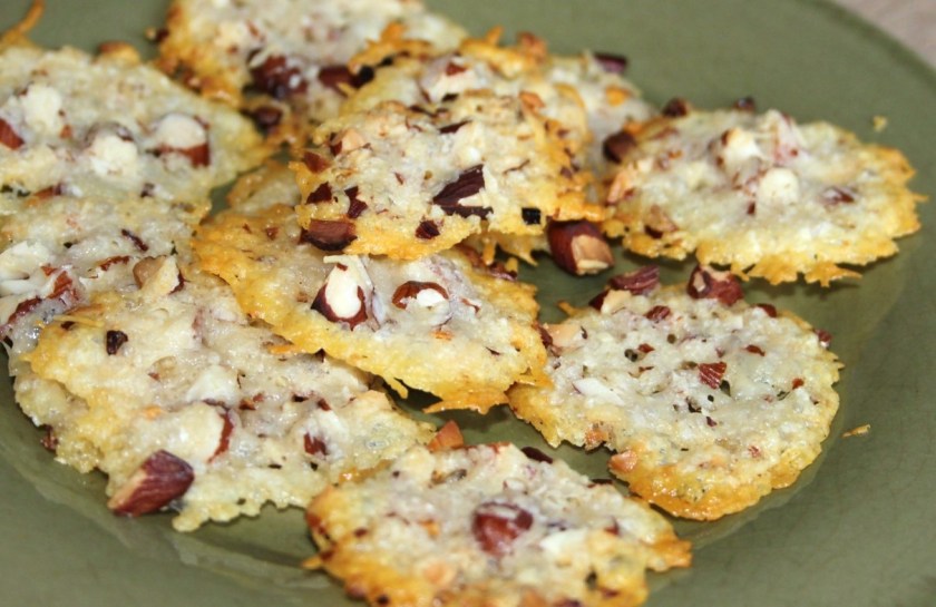 Perfekt som lidt nips til en velkomstdrink. Små, sprøde parmesankiks med hakkede mandler.