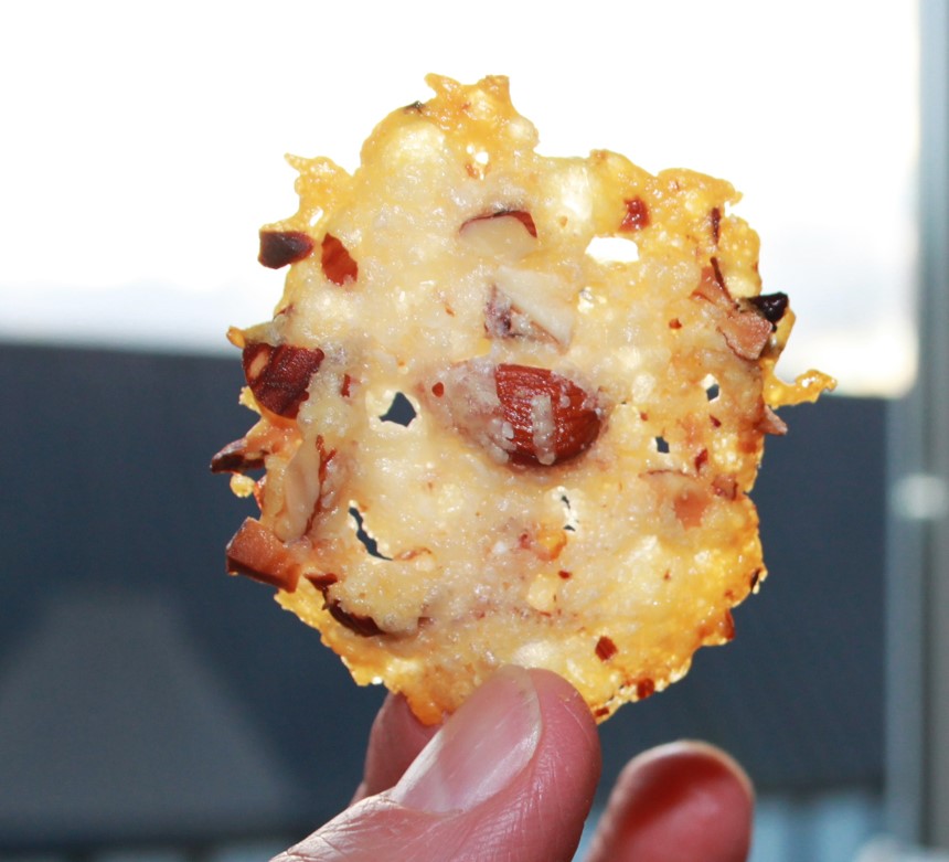 Riv parmesan – eller grana – på den fine side af rivejernet, hak en håndfuld mandler groft, bland det hele og sæt små toppe af blandingen på en bageplade. Lav god afstand mellem toppene – de flyder ud. Bag dem på 200 grader i 3-5 minutter – hold øje – det går hurtigt, og de skal kun lige blive lysebrune i kanten. Bliver de mørkere, bliver parmesanen bitter.