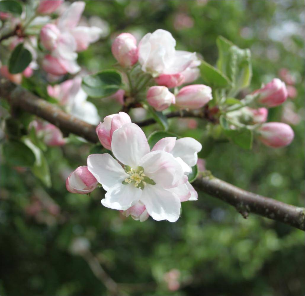 Knopperne har et rosa skær, og når blomsterne springer rigtigt ud, er de hvide. Kridhvide.