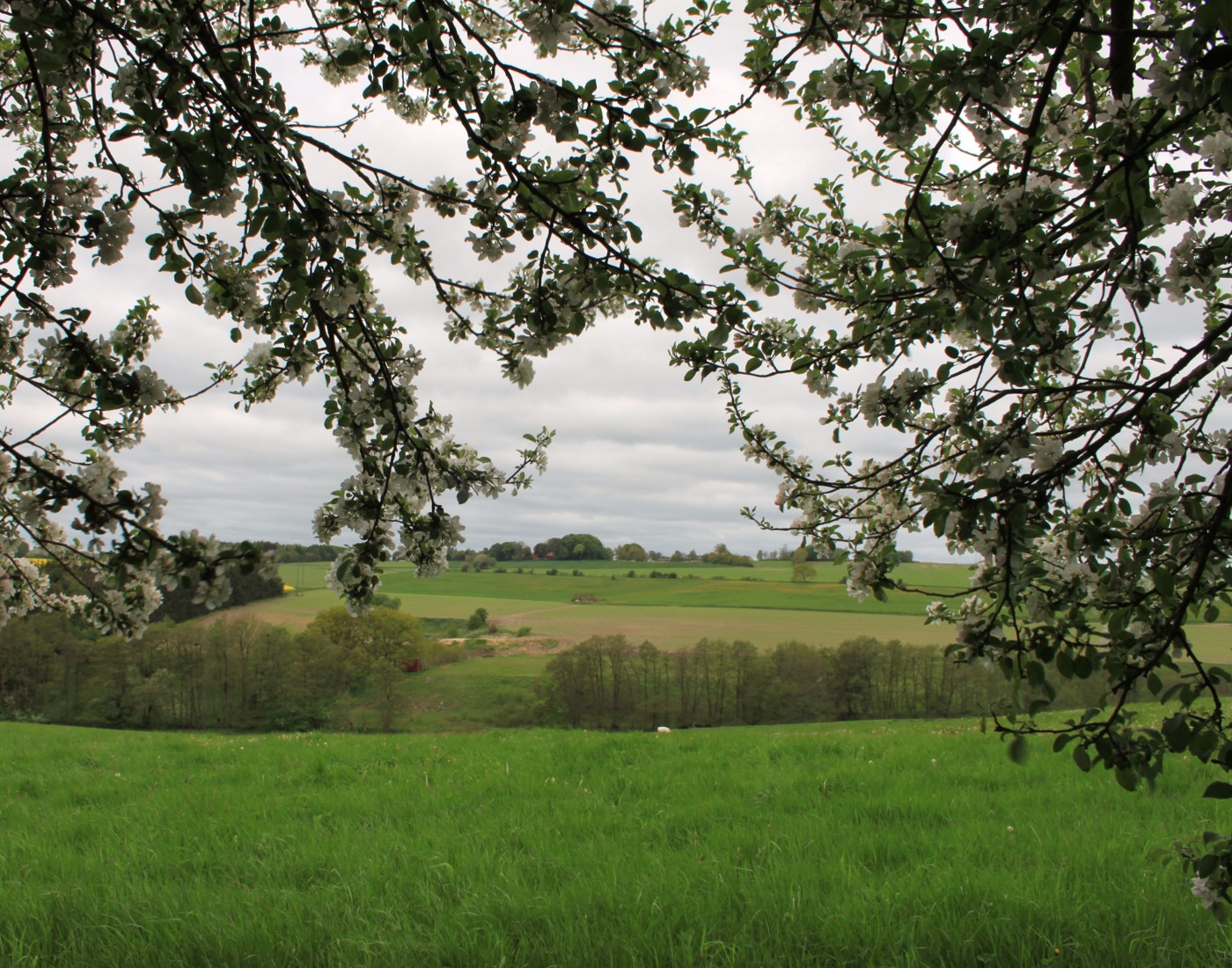 Det enorme, gamle vildæbletræ i hegnet blomstrer. Hvert år er det et fantastisk syn. Millioner af hvide blomster, der får træet til at svæve som en sky over marken.