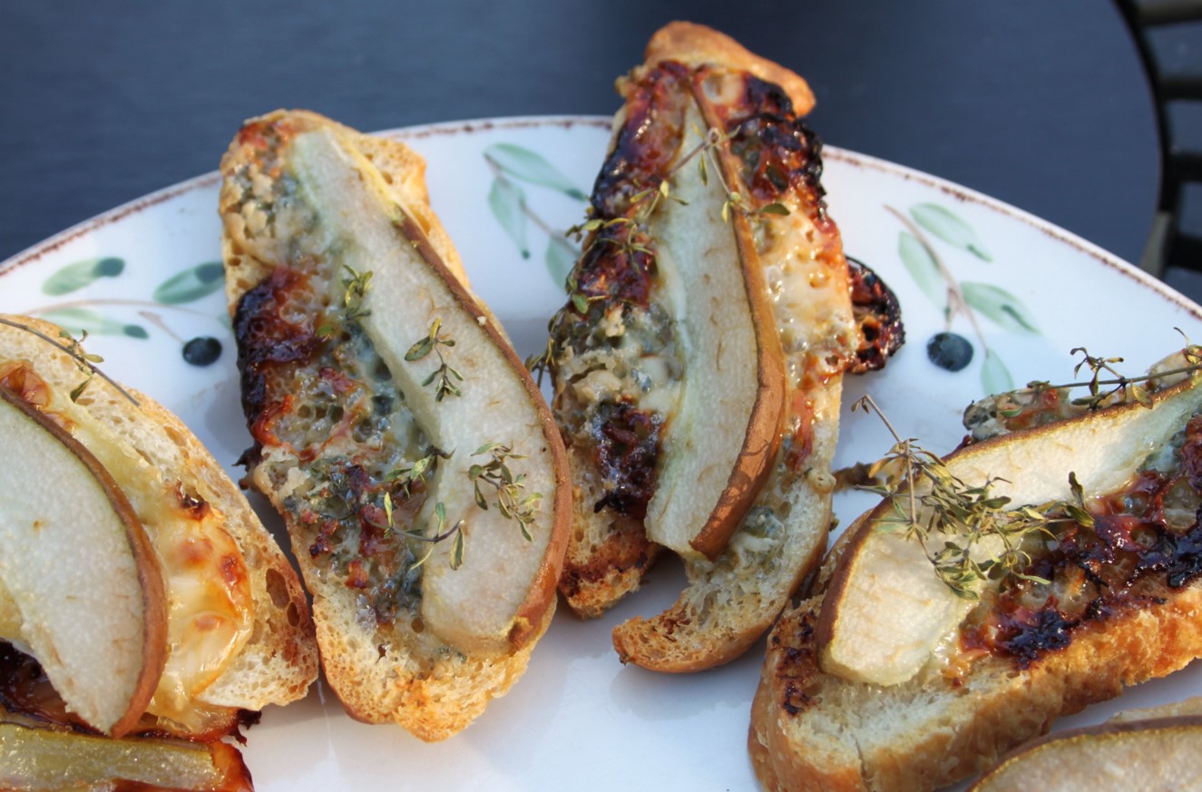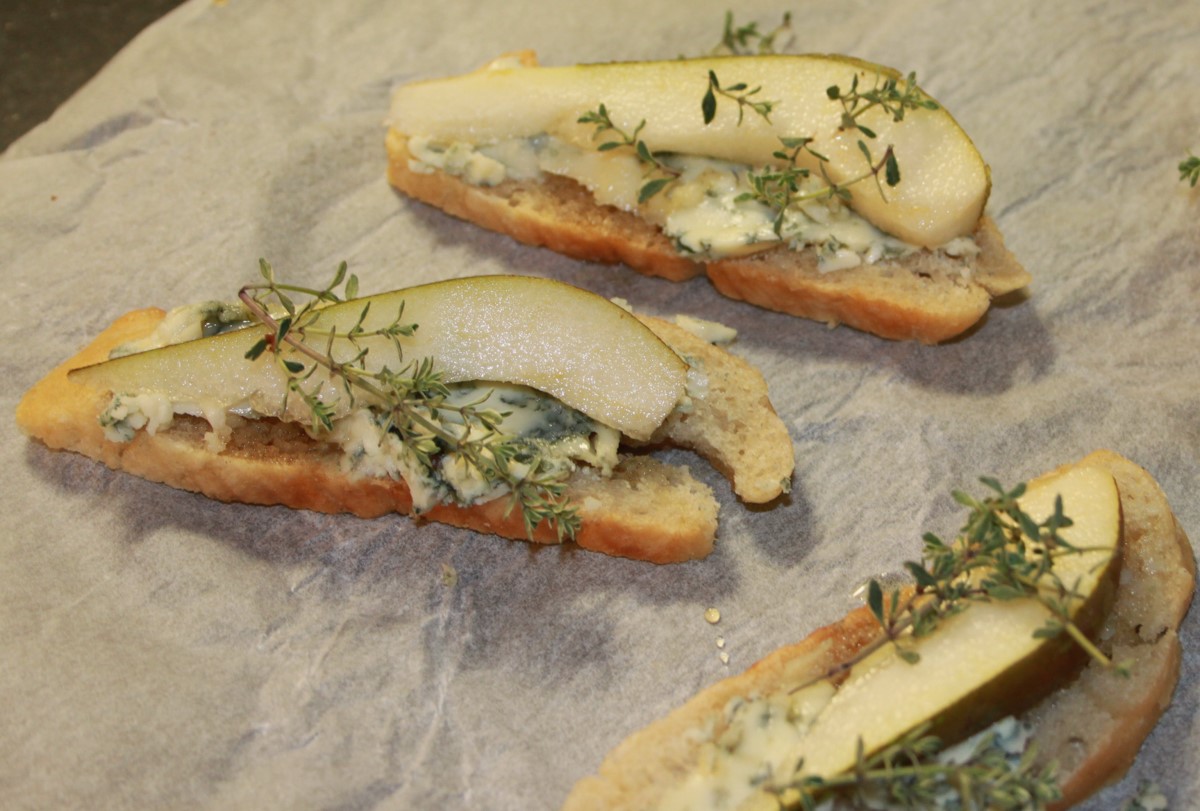 Hapserne her – bruschetta med Danablu, honning, pære og timian er hurtigt lavet, og de kan gøres klar på forhånd og først bages, lige når man skal bruge dem.