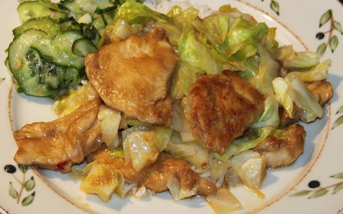 Her er de bløde, møre kyllingestykker brugt i en ret med spidskål i en krydret woksauce.