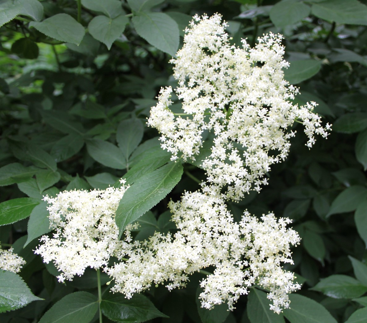 Duften er berusende og kilder næsen, når man går ud og ind. Hylden blomstrer i hegnet og i haven. Om end den i haven er en lidt mere forædlet type.