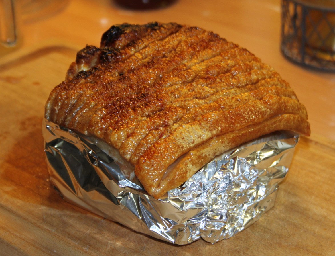 Sæt så stegen ind under grill med varmluft, til sværen popper op og bliver sprød. Tag den ud og pak den ind i sølvpapir – kun stegen, ikke sværen.